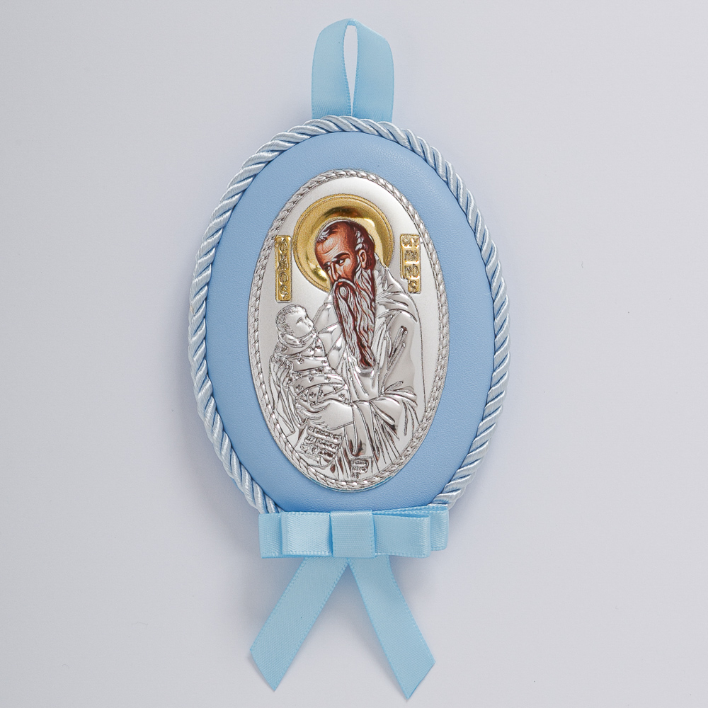 Ασημένια εικόνα – φυλαχτό του Αγίου Στυλιανού, προστάτη των βρεφών και των νηπίων, σε γαλάζιο χρώμα.