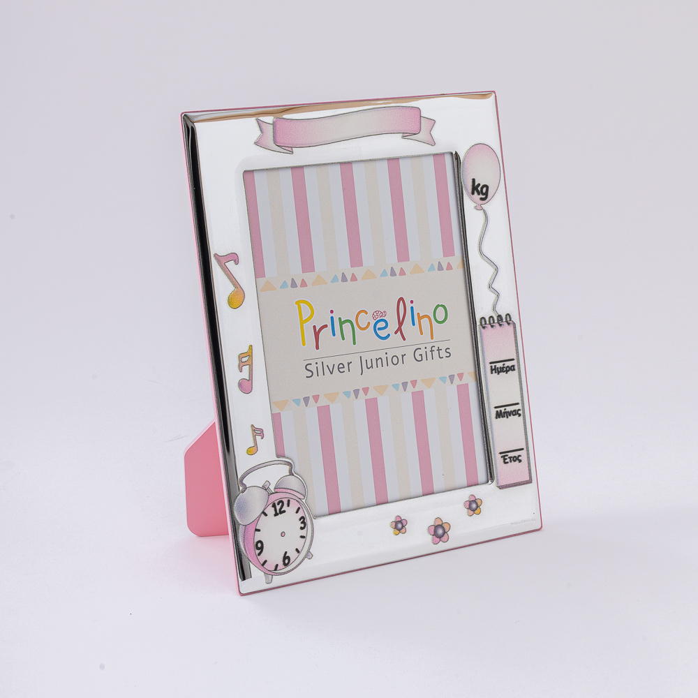 - Κορνίζα σε ασήμι 925 επάνω στην οποία μπορείτε να σημειώσετε με ανεξίτηλο μαρκαδόρο το όνομα της μπέμπας, την ώρα, την ημέρα και τα κιλά που γεννήθηκε.