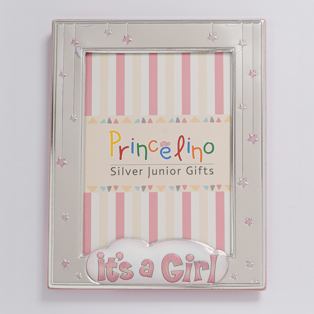 - Κορνίζα σε ασήμι 925 σε μεγάλο μέγεθος, με ροζ αστεράκια και ένα λευκό σύννεφο κατά μήκος της βάσης που γράφει “It’s a girl”.