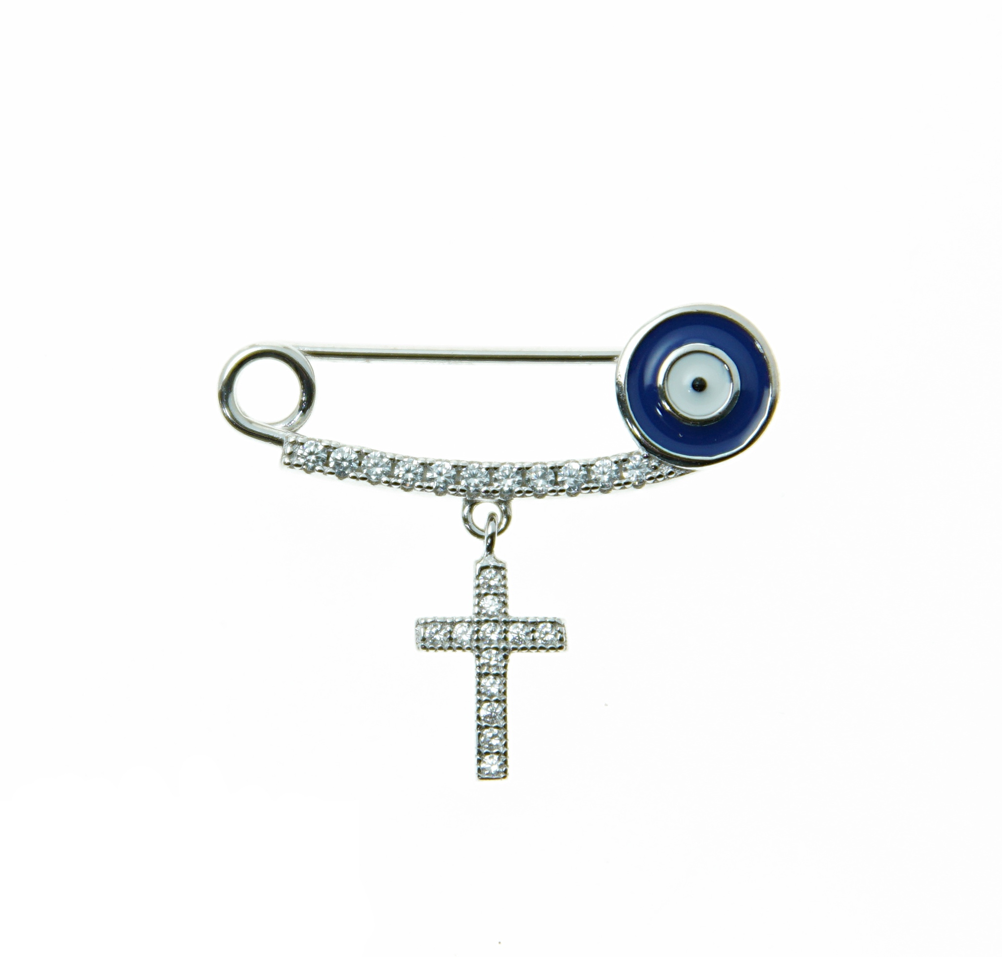 - Φυλαχτό παραμάνα από ασήμι 925 με κομψή, καμπυλωτή γραμμή, γαλάζιο ματάκι – σύμβολο τύχης και θετικής ενέργειας – και λαμπερό σταυρό.