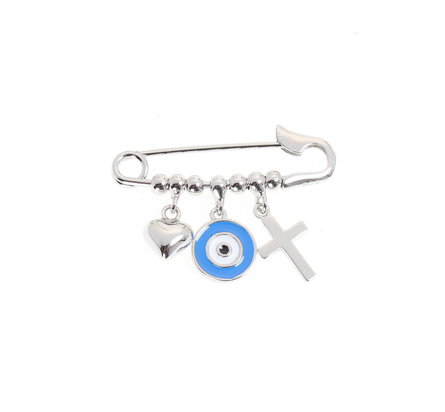 - Ασημένιο φυλαχτό παραμάνα από ασήμι 925 με τρία ξεχωριστά στοιχεία: έναν διαχρονικό σταυρό, μια γλυκιά καρδούλα που συμβολίζει την αγάπη και ένα γαλάζιο ματάκι για καλή τύχη και προστασία.