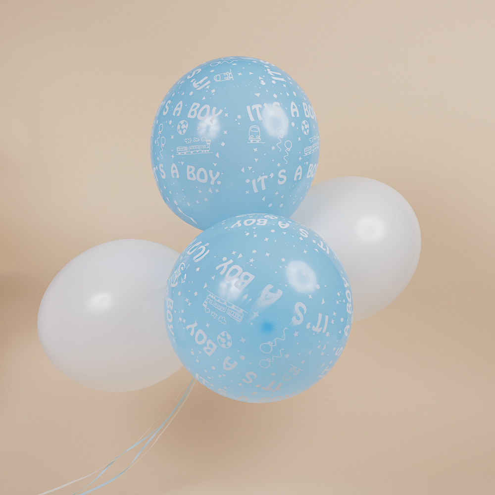 Καλώς ορίστε το νεογέννητο μπέμπη με ένα μπουκέτο με τέσσερα μπαλόνια, δύο λευκά και δύο γαλάζια, όλα φουσκωμένα με ήλιον και απογειώστε το δώρο σας!