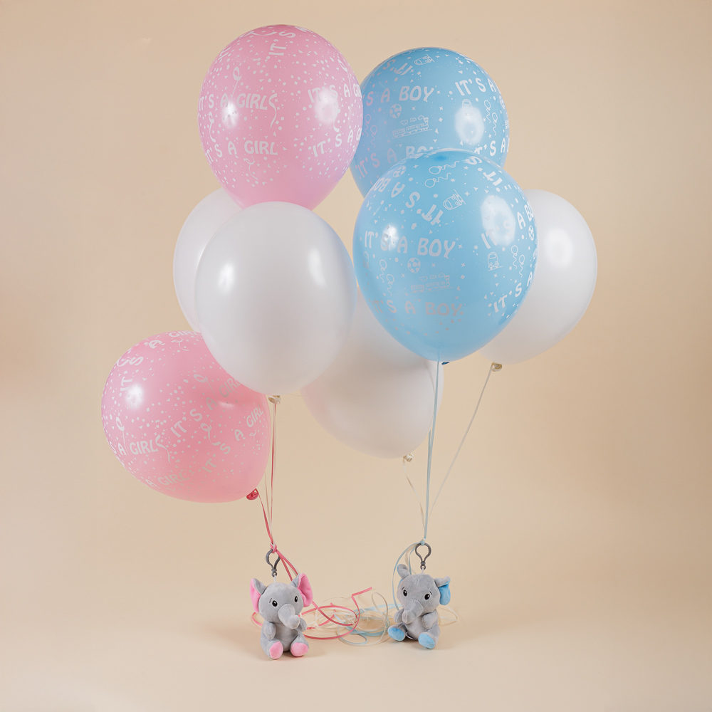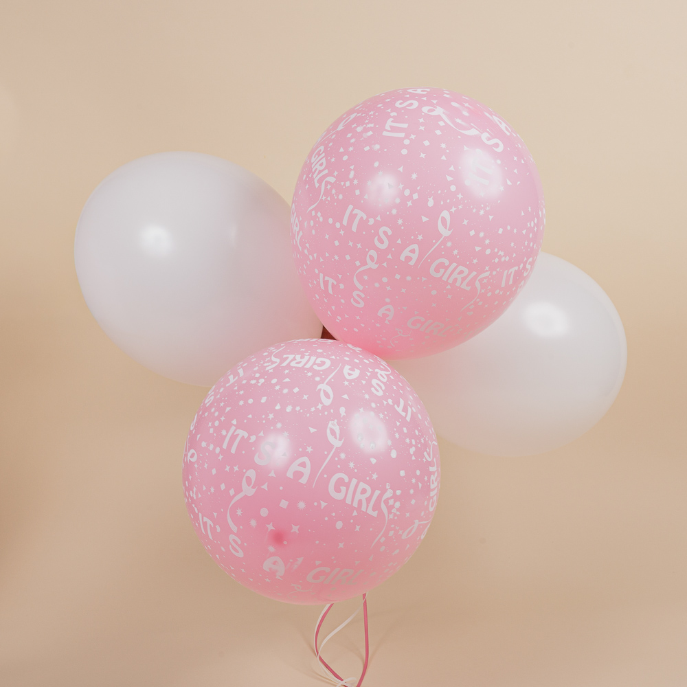 Καλώς ορίστε τη νεογέννητη μπέμπα με ένα μπουκέτο με τέσσερα μπαλόνια, δύο λευκά και δύο ροζ, όλα φουσκωμένα με ήλιον και απογειώστε το δώρο σας!