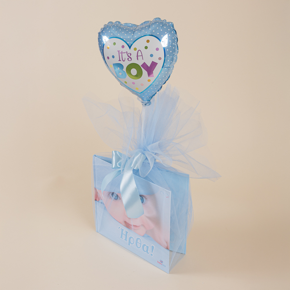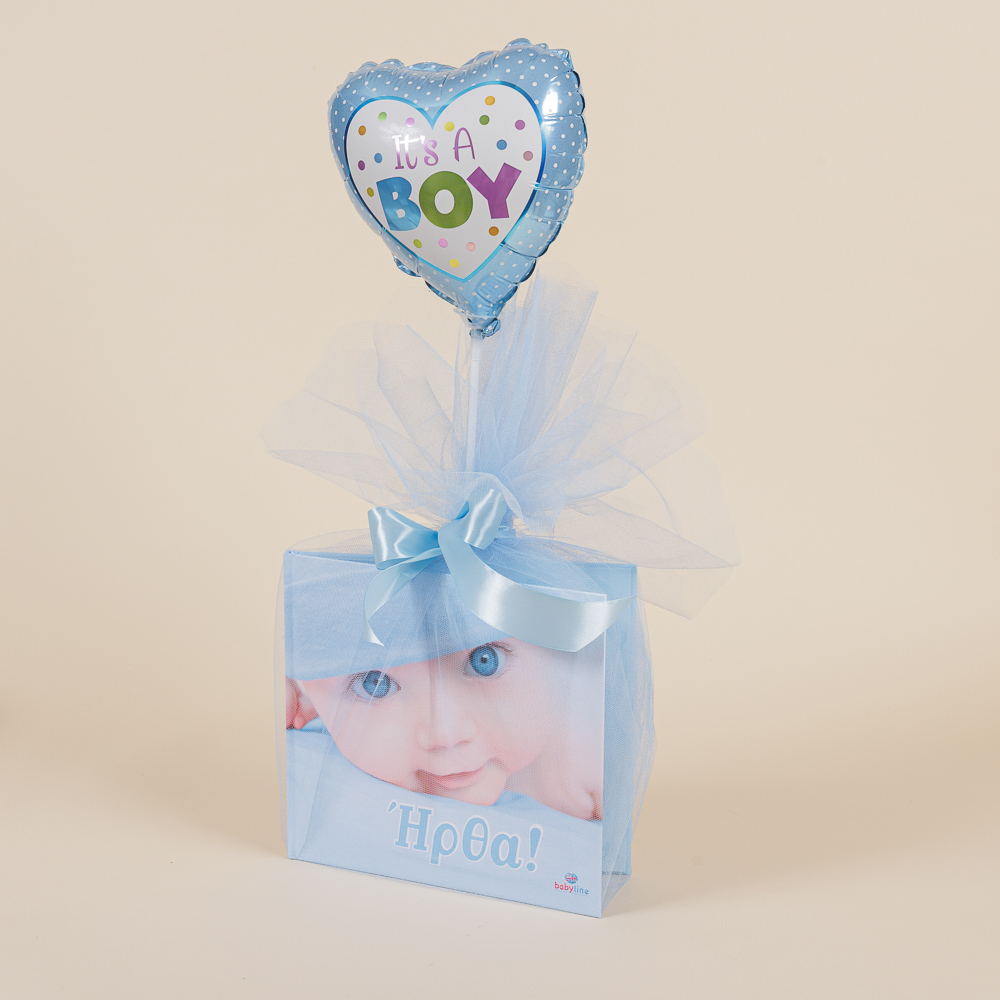 - Μπαλόνι στικ γαλάζια καρδούλα “It’s a boy”, για να δώσετε ακόμη περισσότερο χρώμα στο δώρο σας! Το μπαλόνι στικ παραμένει αναλλοίωτο για μεγάλο χρονικό διάστημα και να θυμίζει σε όλους την άφιξη του μικρού πρίγκιπα!