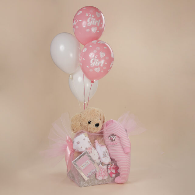 Δώρο γέννησης για κορίτσι με λούτρινο σκυλάκι, κορνίζα 925 It’s a Girl, βρεφικά ρούχα και ροζ μπαλόνια σε κουτί Babyline