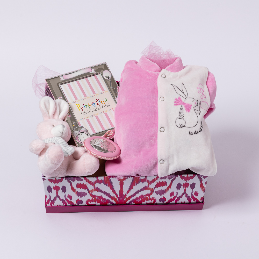 Μια ξεχωριστή δωροσύνθεση για τη νεογέννητη μπέμπα, με λαμπερά και κομψά δώρα!