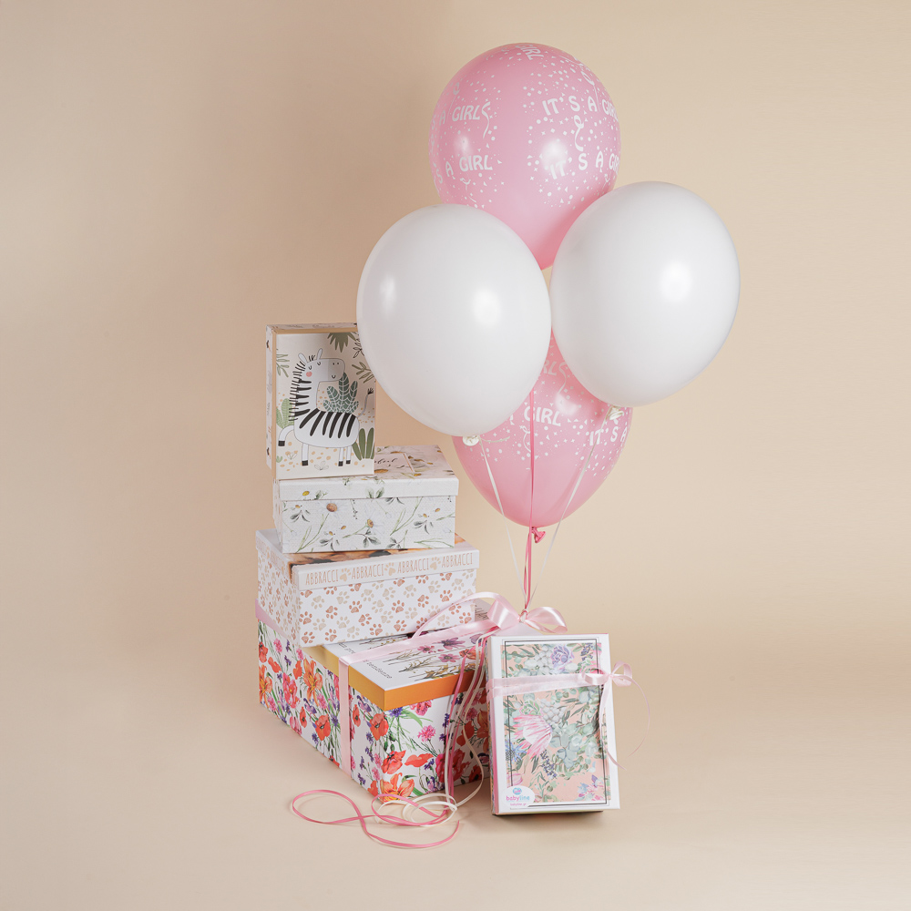 Συμπληρώστε την όμορφη αυτή δωροσύνθεση, με μία ευχετήρια κάρτα για δίδυμα, ένα ή περισσότερα μπαλόνια φουσκωμένα με ήλιον ή με χρωματιστά ταμπελάκια it’s a girl!