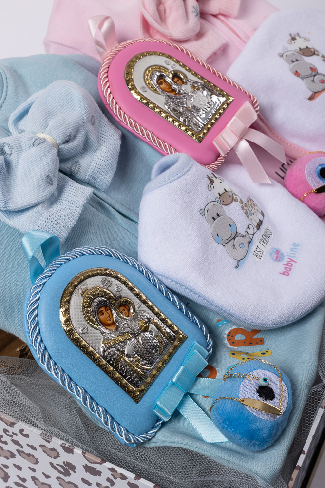 - Δύο ασημένια σετ: δύο εικόνες της Παναγίας με τον Χριστό και δύο βρεφικές ταυτότητες σε yellow gold, σε γαλάζιο και σε ροζ χρώμα, τα οποία διατίθενται με το απαραίτητο πιστοποιητικό γνησιότητας της επίσημης αντιπροσωπείας, .