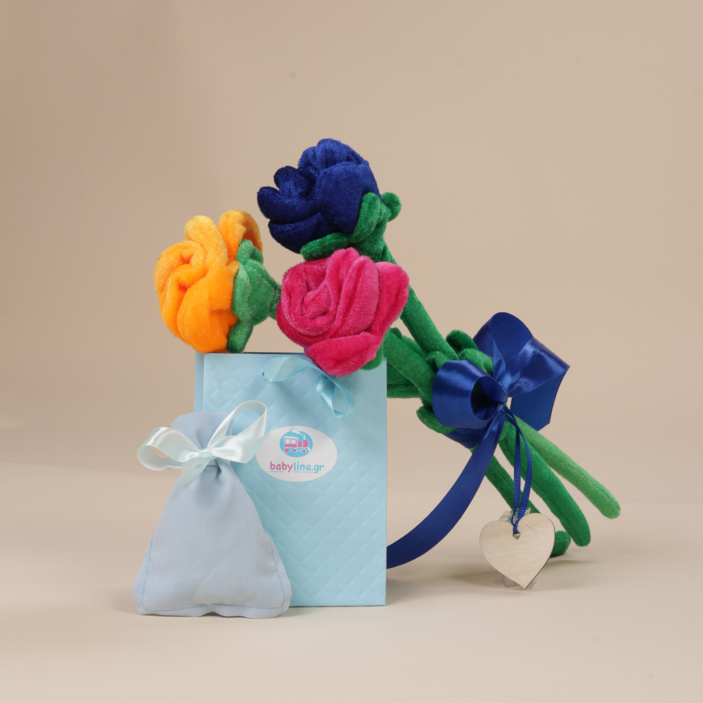 Ένα φυλαχτό με σταυρό και ματάκι και ένα μπουκέτο από 3 λούτρινα ζωηρόχρωμα λουλούδια, ενώνονται σε ένα τρυφερό δώρο αγάπης — ιδανικό για να εκφράσετε τα πιο όμορφα συναισθήματα στις νέες μανούλες!