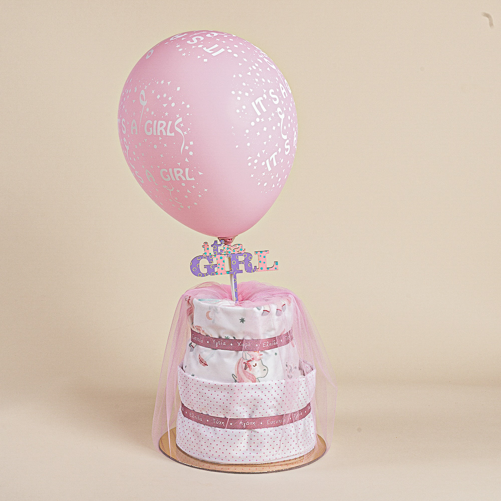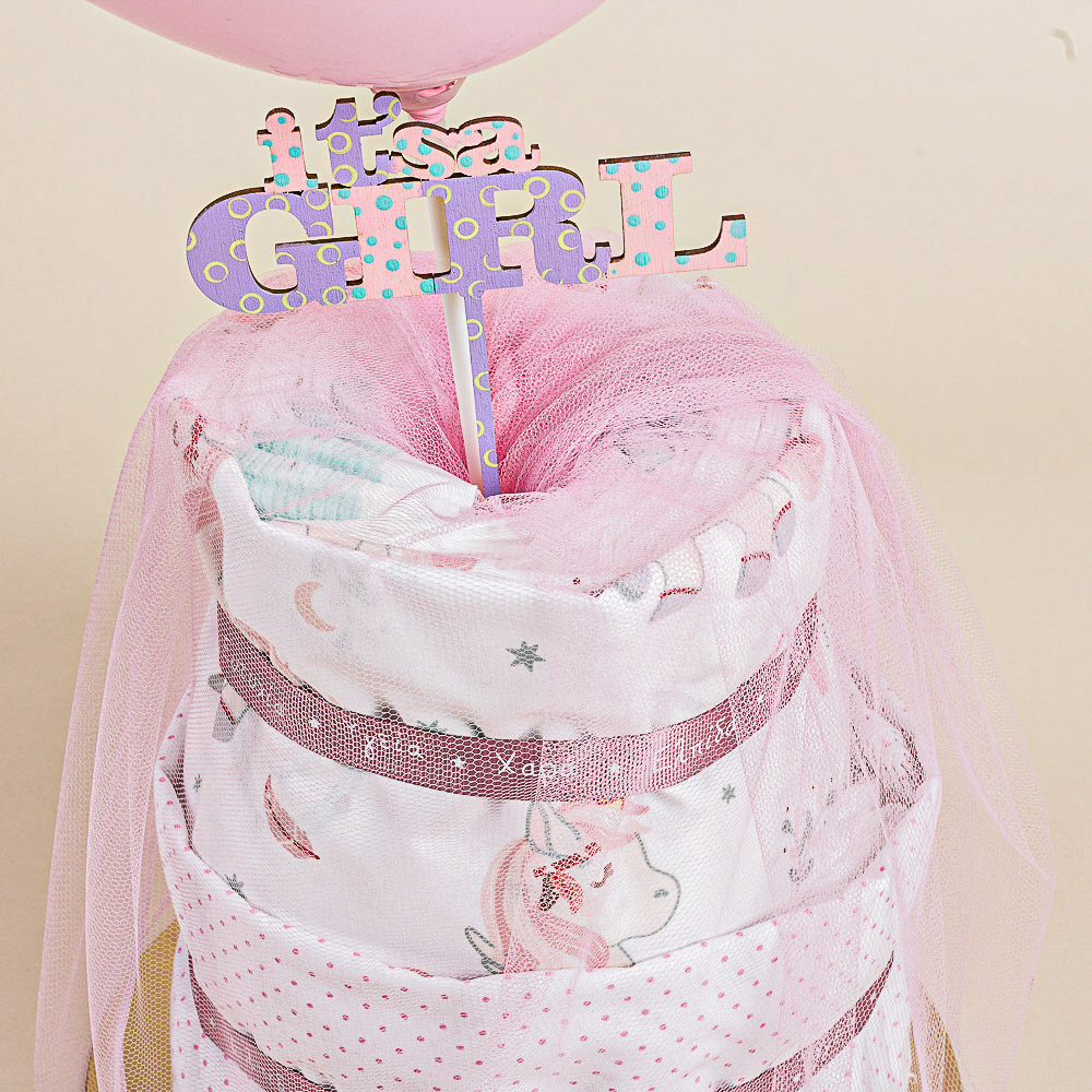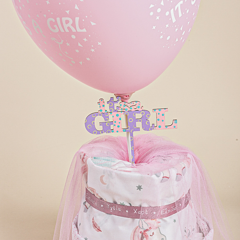 Diaper cake ή αλλιώς τούρτα από πάνες, σεντονάκια για το λίκνο και ξύλινο ταμπελάκι “It’s a girl” σε μία δωροσύνθεση έκπληξη!