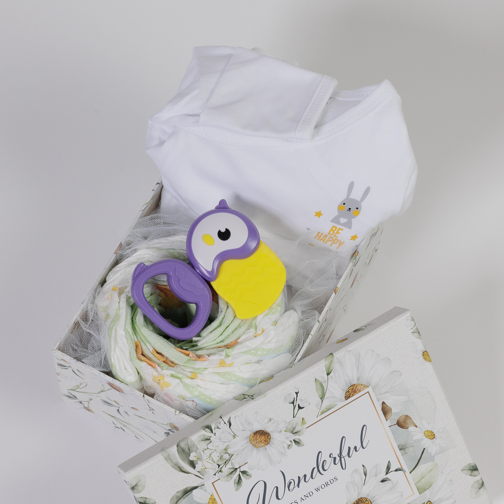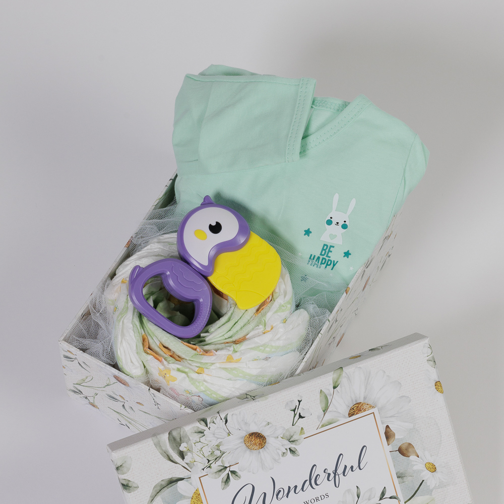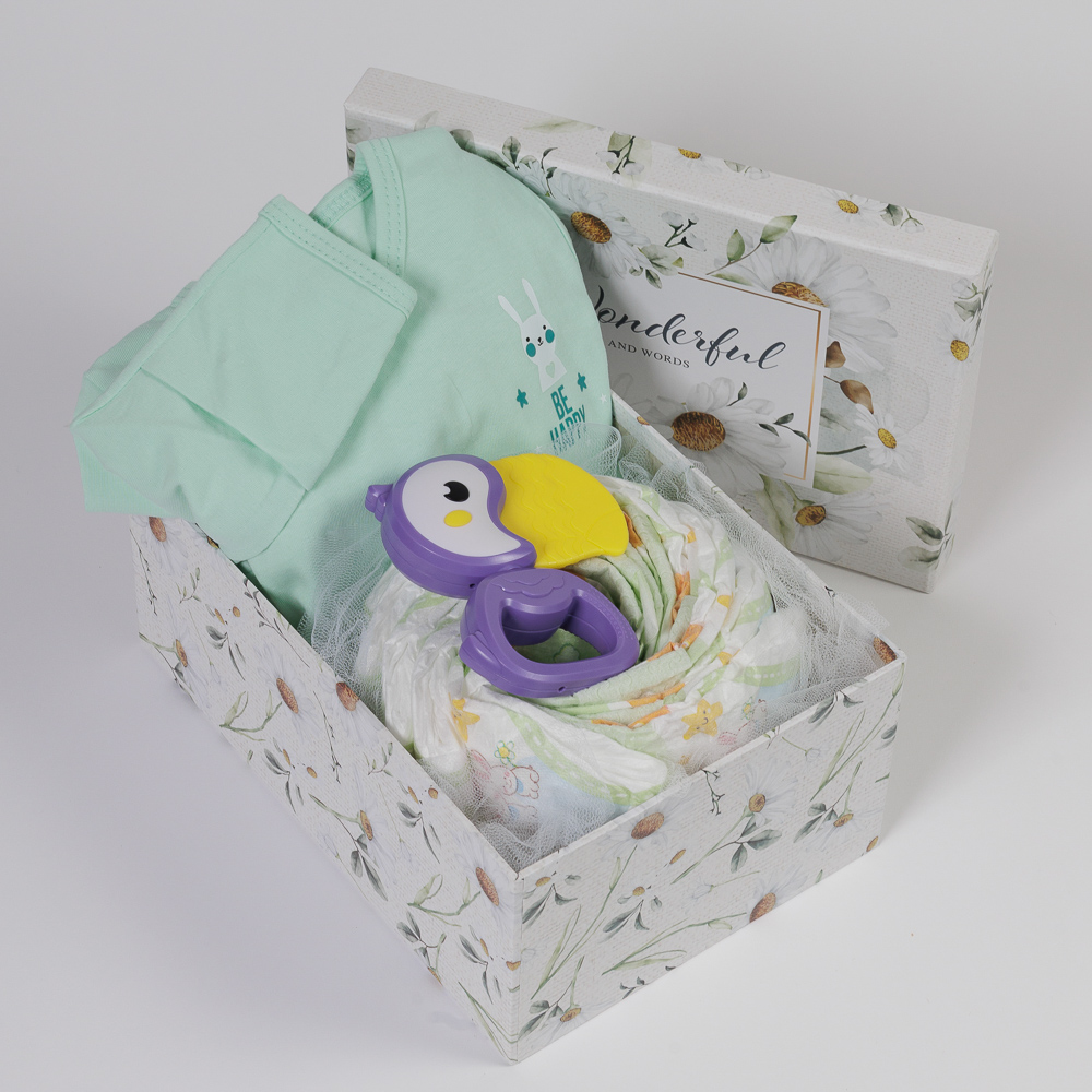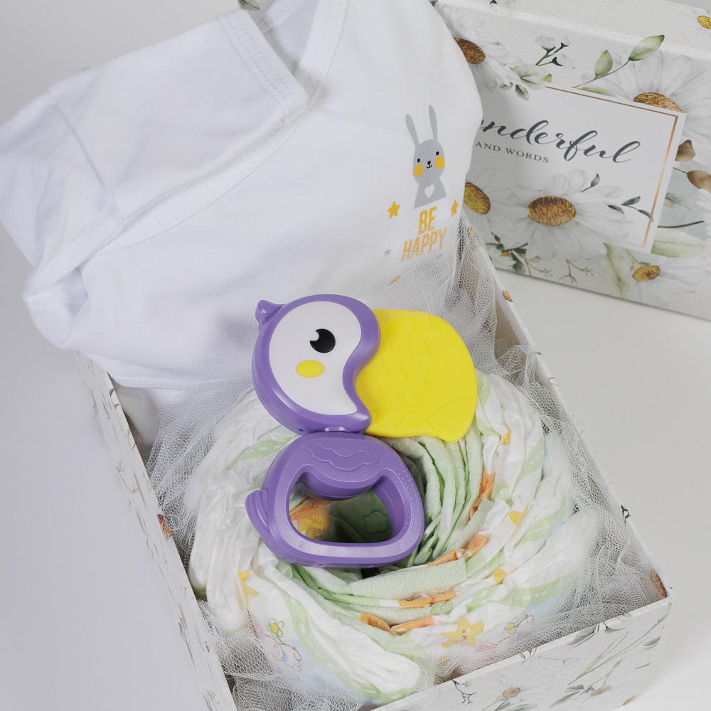 - Mini Diaper Cake με τις πάνες που θα χρειαστεί το νεογέννητο τα πρώτα 24ωρα στο σπίτι (9τμχ).