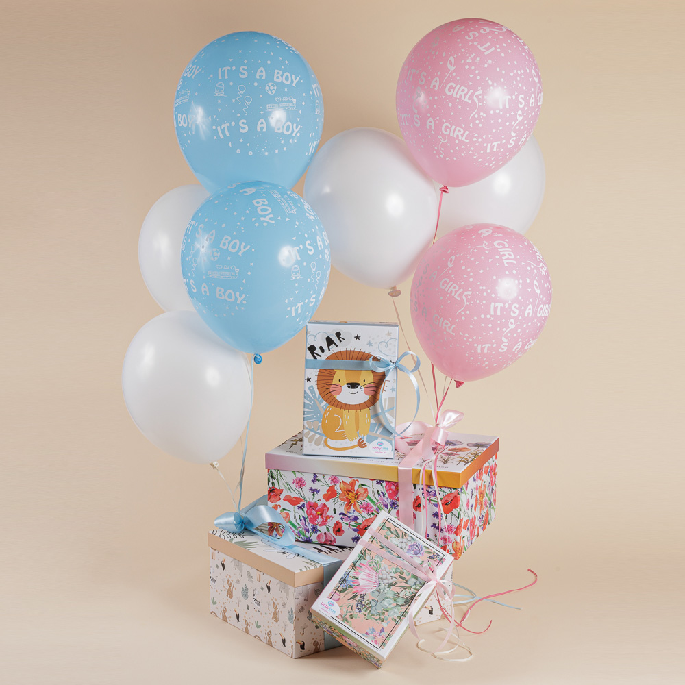 Συμπληρώστε αυτή την δωροσύνθεση διαλέγοντας ένα μπαλόνι φουσκωμένο με ήλιον που θα δέσουμε επάνω στο κουτί σας. Και μην ξεχάσετε την ευχετήρια κάρτα, για να μεταφέρουμε τις ευχές και την αγάπη σας στο νεογέννητο και τους νέους γονείς!