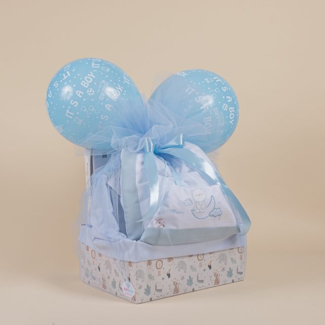 - Δύο γαλάζια μπαλόνια δεμένα επάνω στον φιόγκο για έξτρα εορταστικό χαρακτήρα!