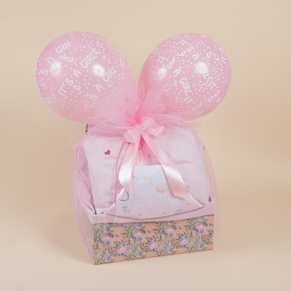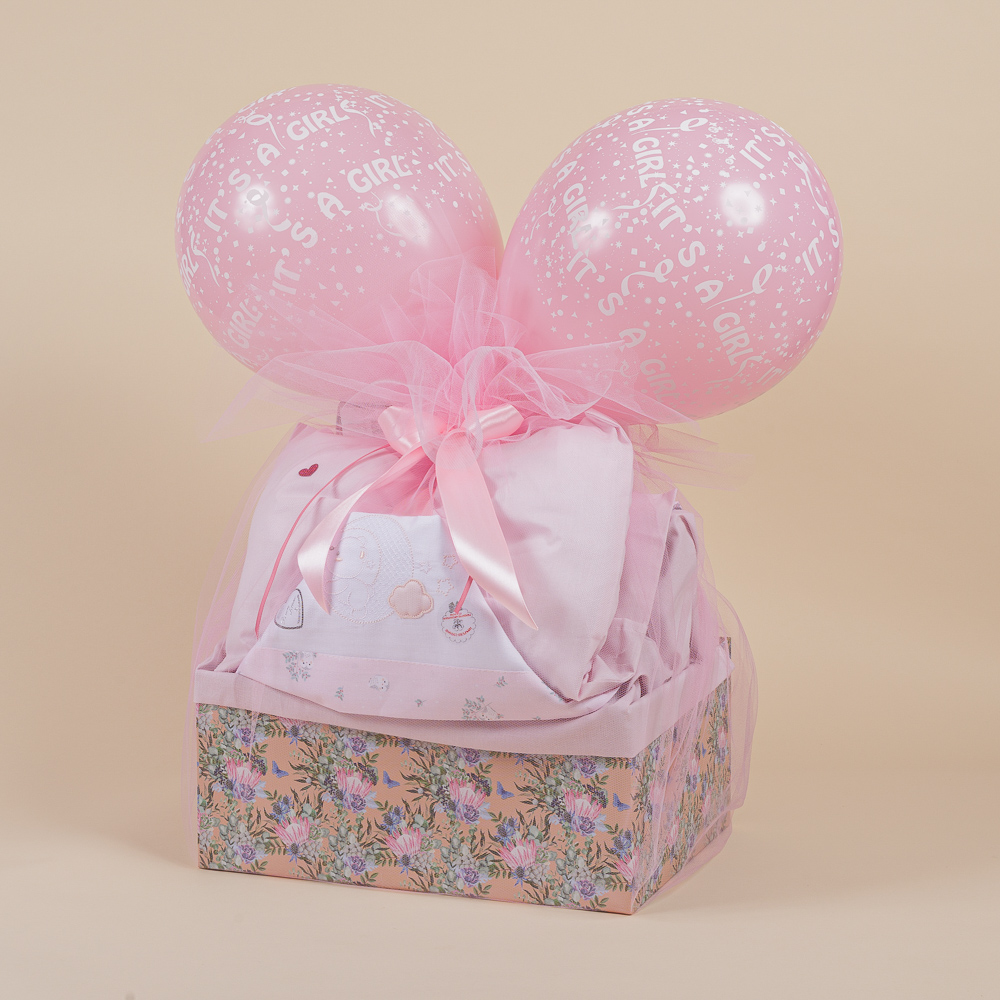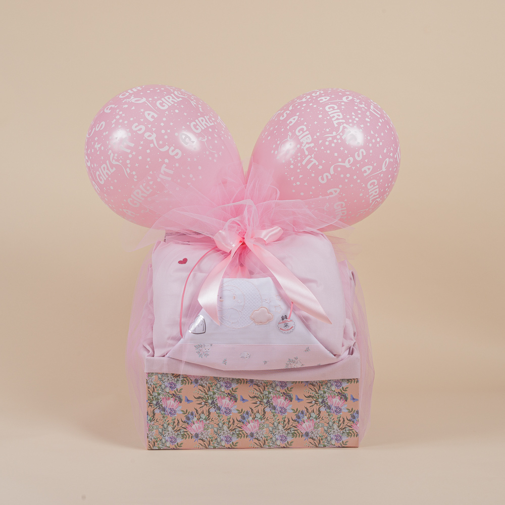 - Δύο ροζ μπαλόνια δεμένα επάνω στον φιόγκο για έξτρα εορταστικό χαρακτήρα!