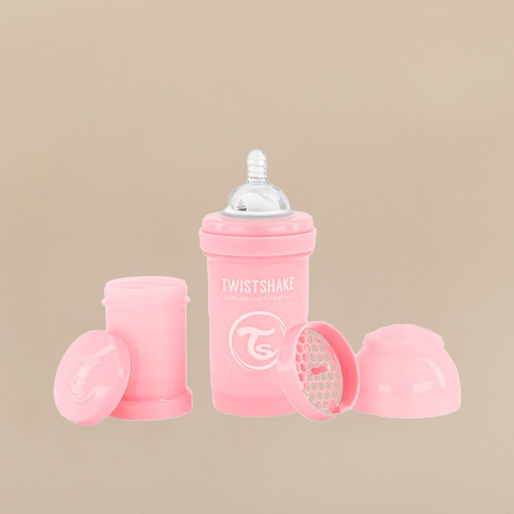 • Μπιμπερό Twistshake ροζ κατά των κολικών, με πρακτικό δοχείο αποθήκευσης των βρεφικών γευμάτων, δίχτυ ανάμιξης και θηλή σιλικόνης.