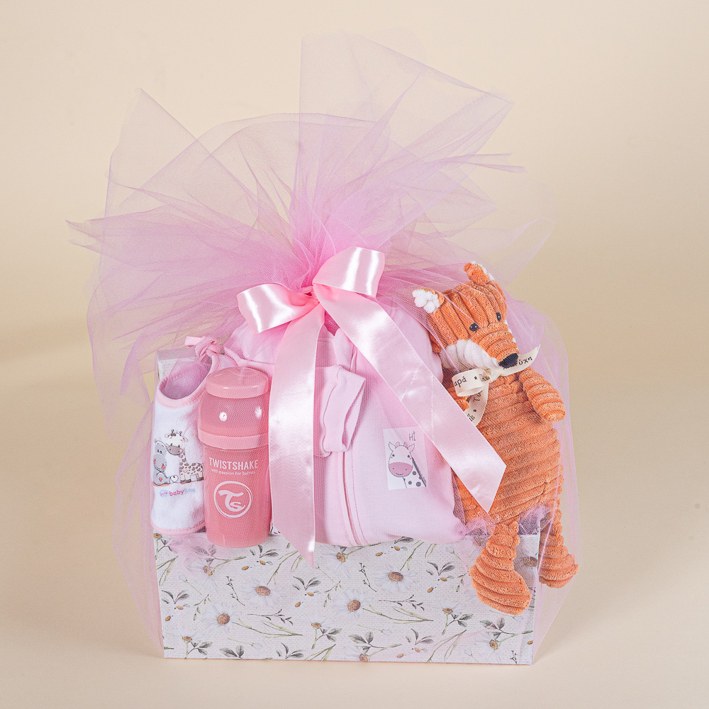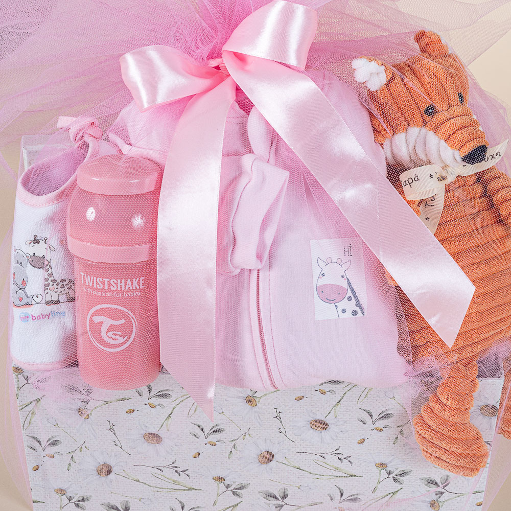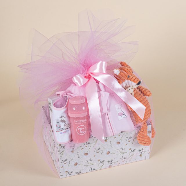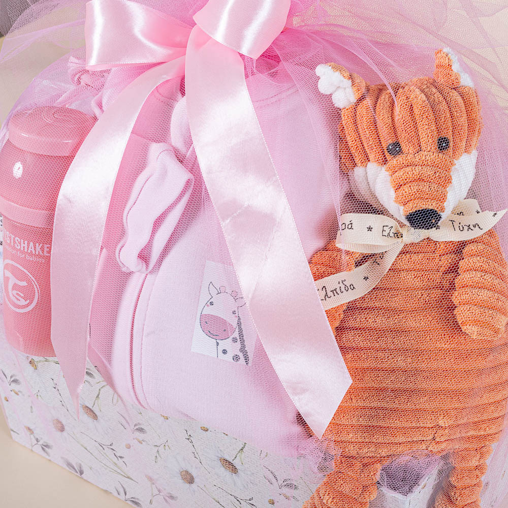 Μία ξεχωριστή δωροσύνθεση, γεμάτη όμορφα δώρα για τη νεογέννητη μπέμπα!