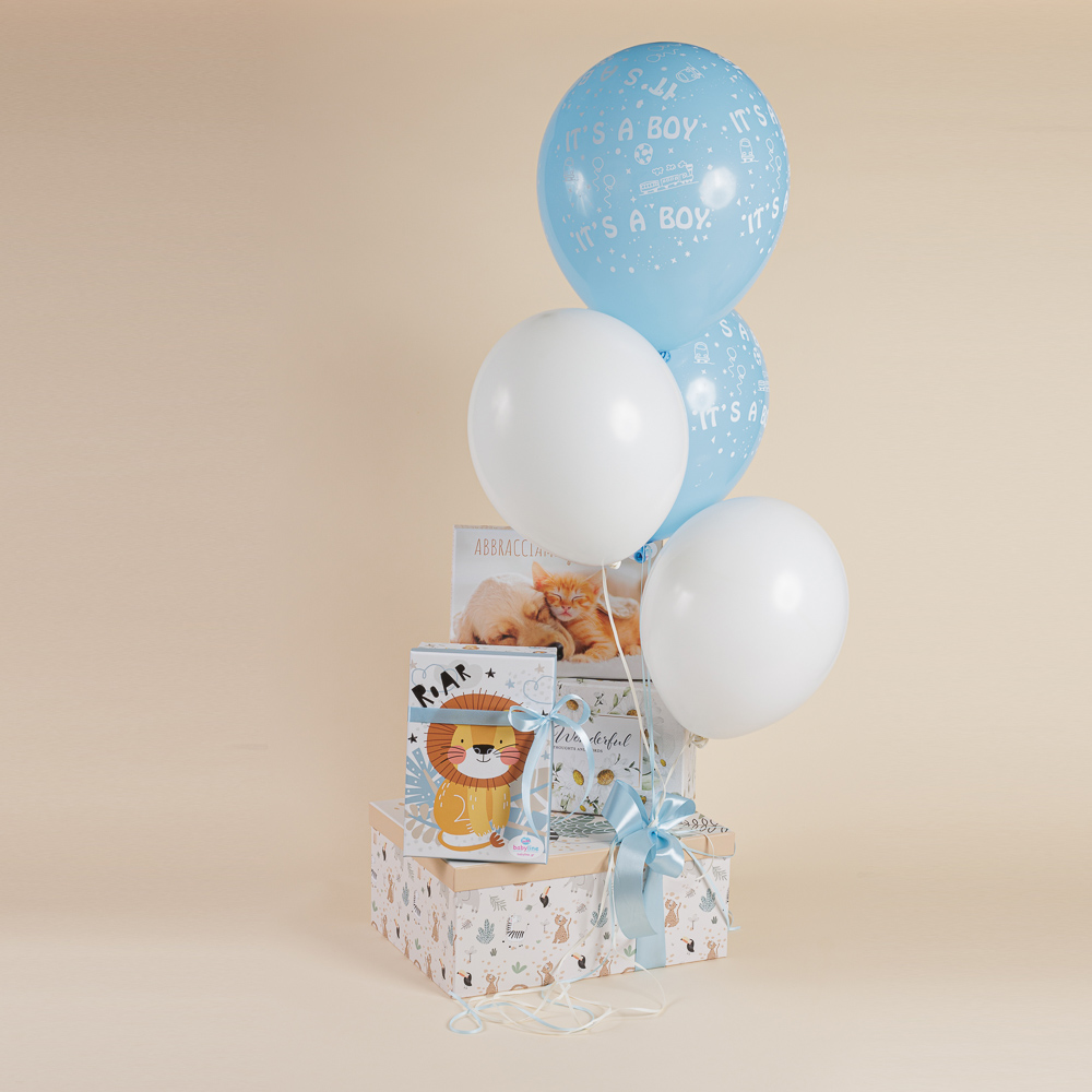 Συμπληρώστε την όμορφη αυτή δωροσύνθεση, με μία ευχετήρια κάρτα για δίδυμα, ένα ή περισσότερα μπαλόνια φουσκωμένα με ήλιον ή με χρωματιστά ταμπελάκια it’s a boy!