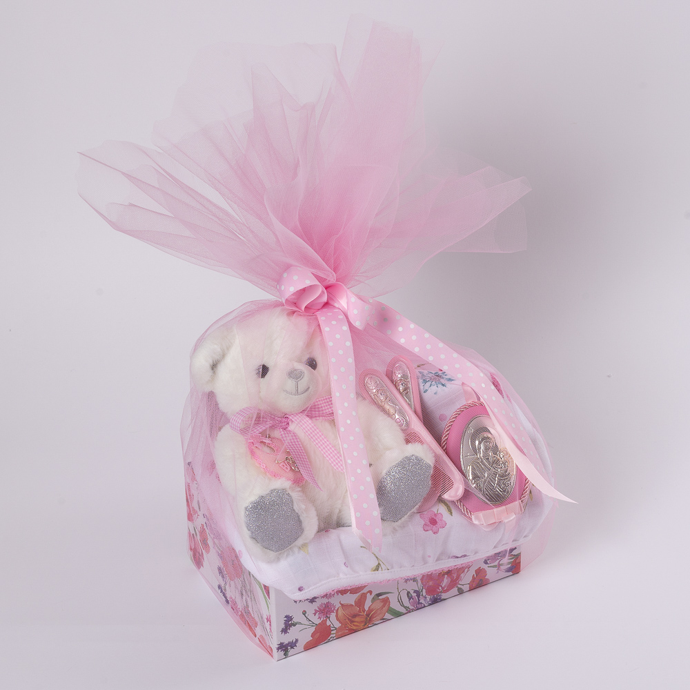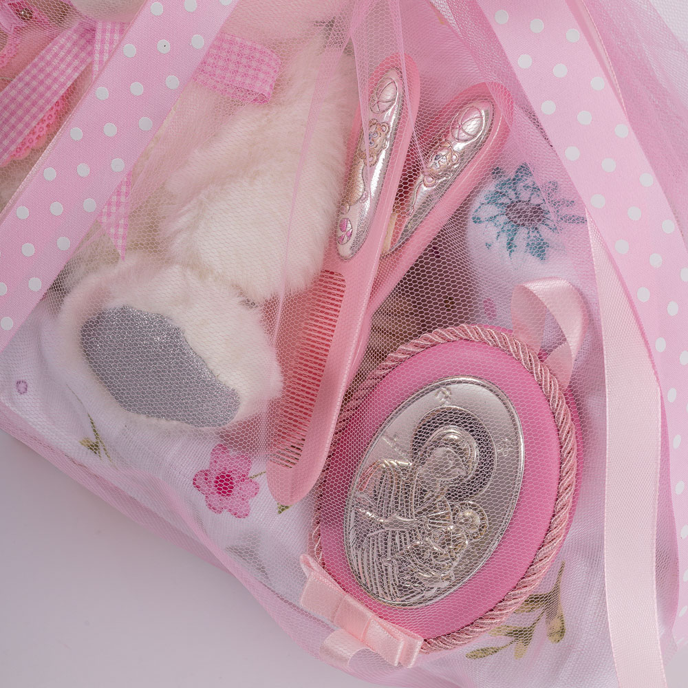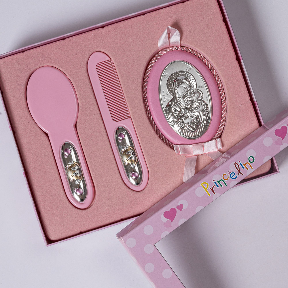 - Ασημένιο σετ: βούρτσα, χτένα και εικόνα της Παναγίας με τον Χριστό, σε ροζ χρώμα. Το σετ διατίθεται με πιστοποιητικό γνησιότητας της επίσημης αντιπροσωπείας.