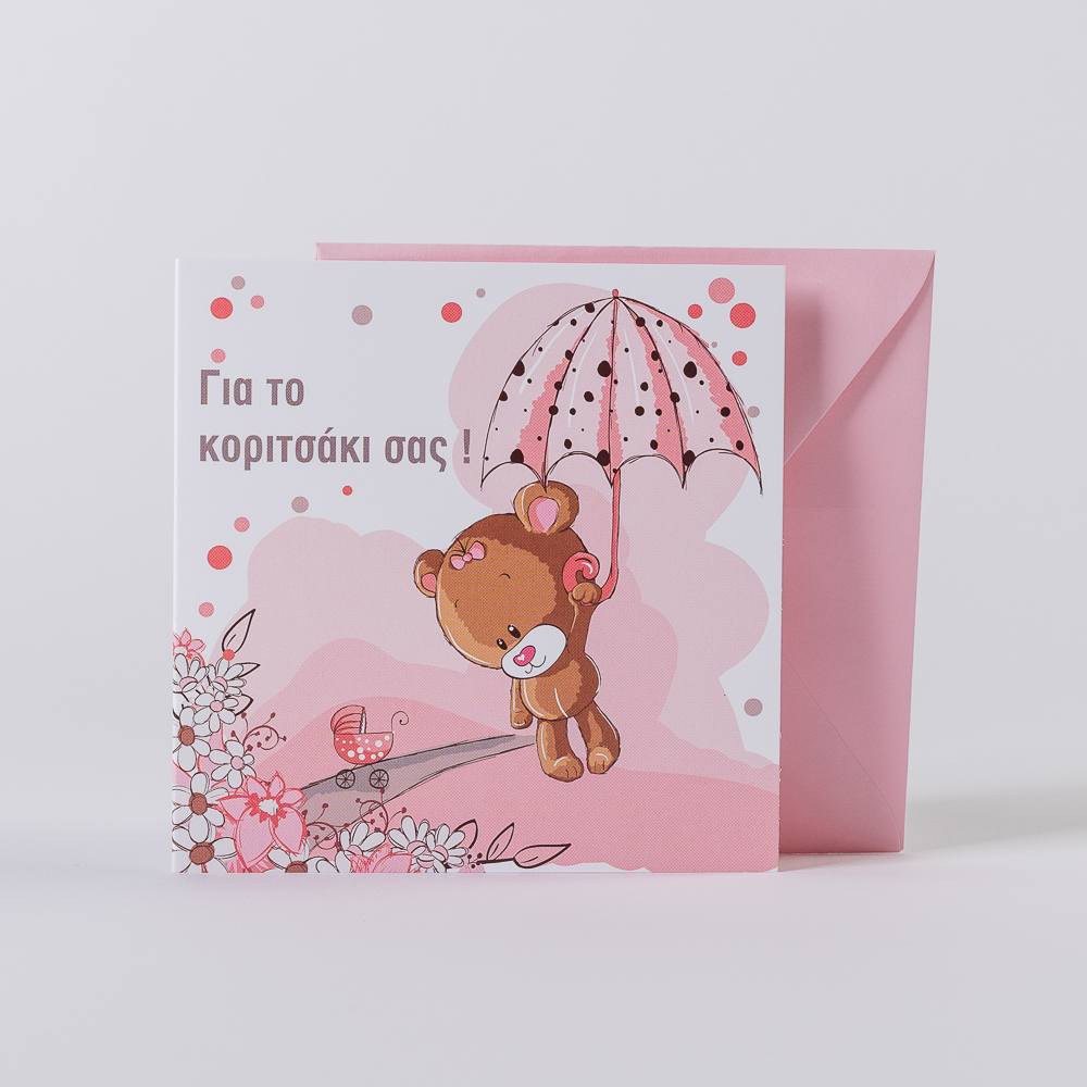 Επιλέξτε την τετράγωνη κάρτα με το όμορφο αρκουδάκι, για να συνοδεύσετε το δώρο σας και να στείλετε ευχές αγάπης στο νεογέννητο!