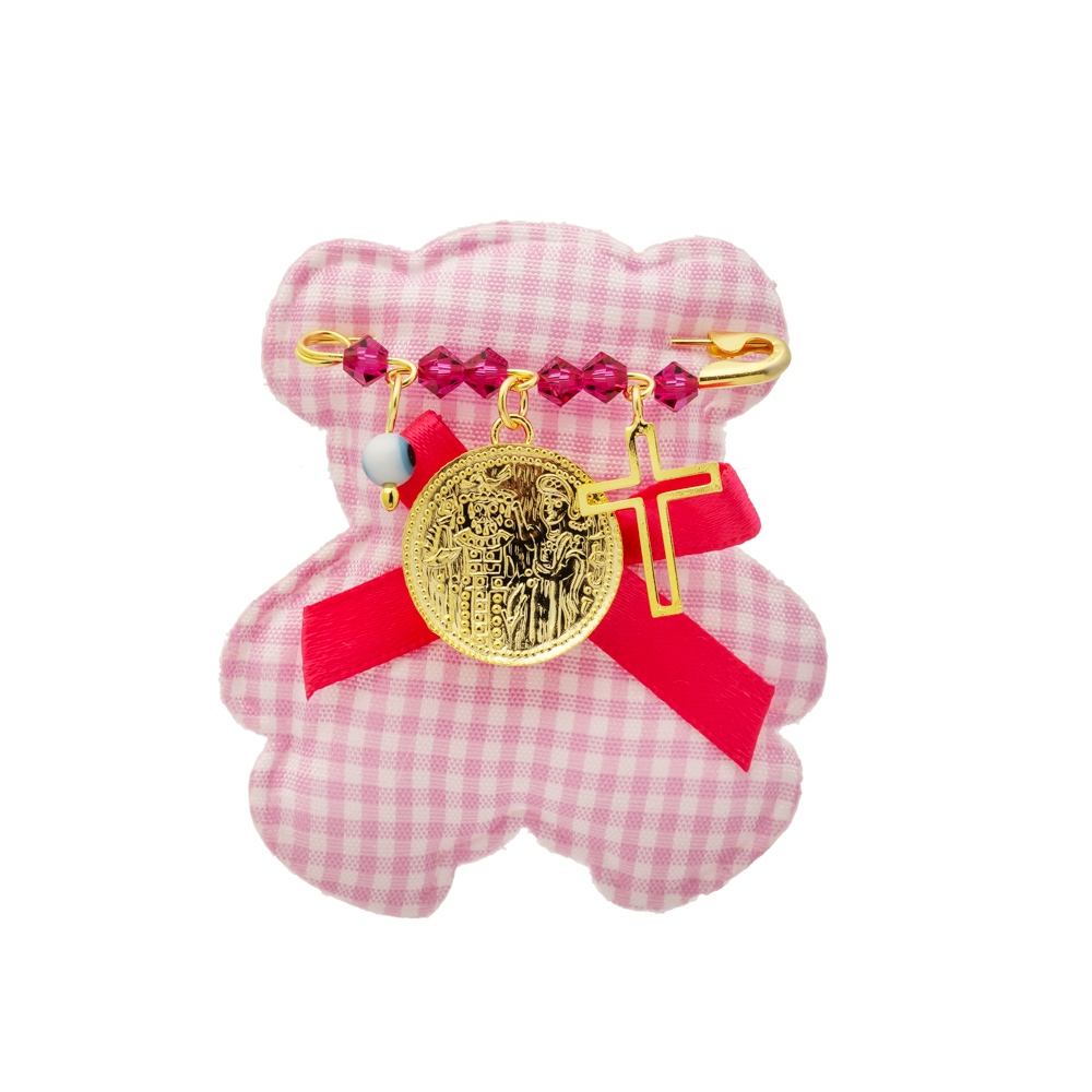 - Το παιδικό φυλαχτό μας σε ασήμι 925, σε yellow gold, περιλαμβάνει ένα Κωνσταντινάτο, έναν σταυρό και ένα ματάκι, καθώς και ροζ χαντρούλες στην παραμάνα.