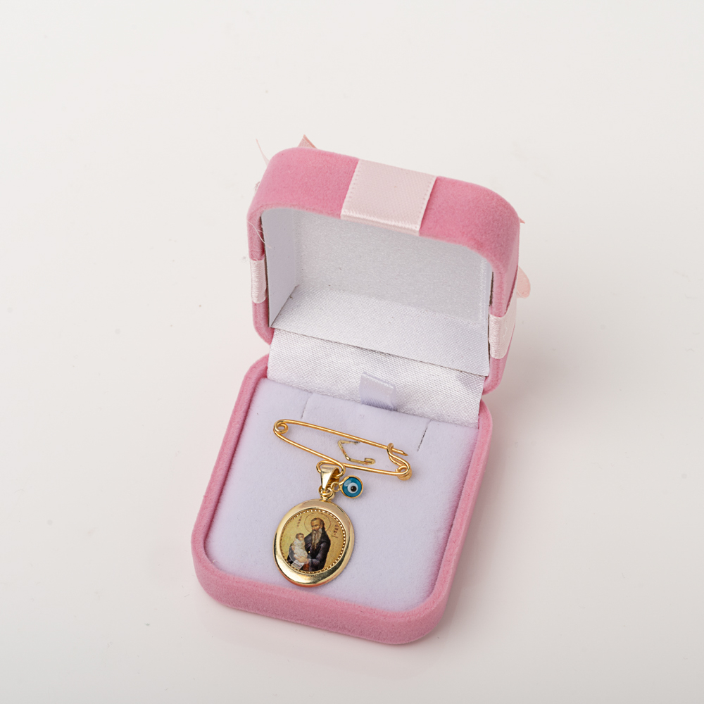 - Το ασημένιο φυλαχτό μας στο χρώμα του χρυσού, περιλαμβάνει μία εικόνα του Αγίου και ένα γαλάζιο ματάκι. Το φυλαχτό απεικονίζει ένα Κωνσταντινάτο φλουρί στην πίσω μεριά.