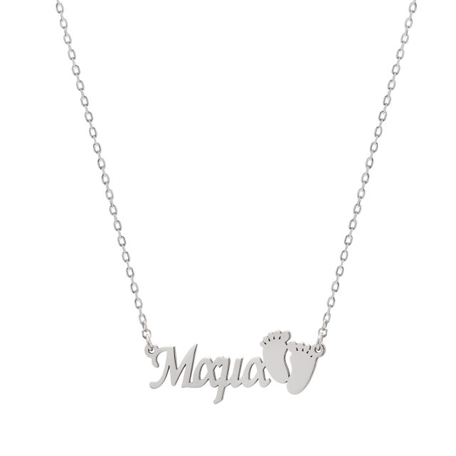 Κολιέ “Μαμά” σε ασήμι 925, διακοσμημένο με δύο χαριτωμένες μωρουδίστικες πατουσίτσες, που θα συνοδεύουν τη νέα μανούλα σε κάθε της βήμα! Περασμένο σε αλυσίδα με αυξομείωση για άψογη εφαρμογή, αποτελεί ένα τρυφερό φυλαχτό για κάθε μαμά.