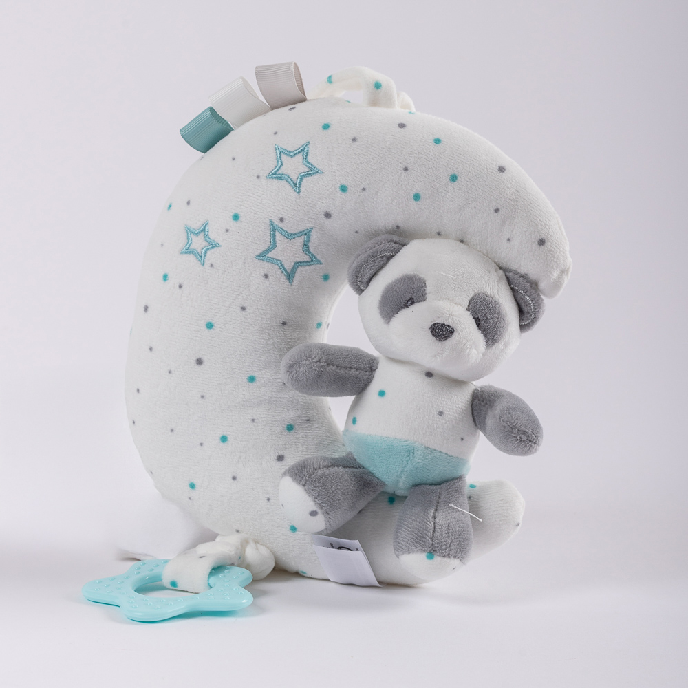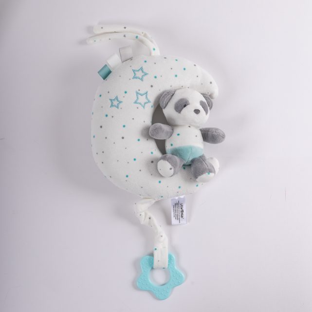 Ένα φεγγάρι επάνω στο οποίο είναι ξαπλωμένο ένα αρκουδάκι, σε βεραμάν, γκρίζες και λευκές αποχρώσεις. Η προέκταση στο κάτω μέρος του λούτρινου, δίνει την δυνατότητα για ένα απαλό παιδικό νανούρισμα που χαλαρώνει και αποκοιμίζει τον μπέμπη σας.