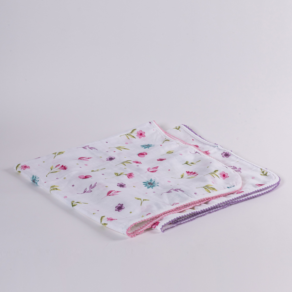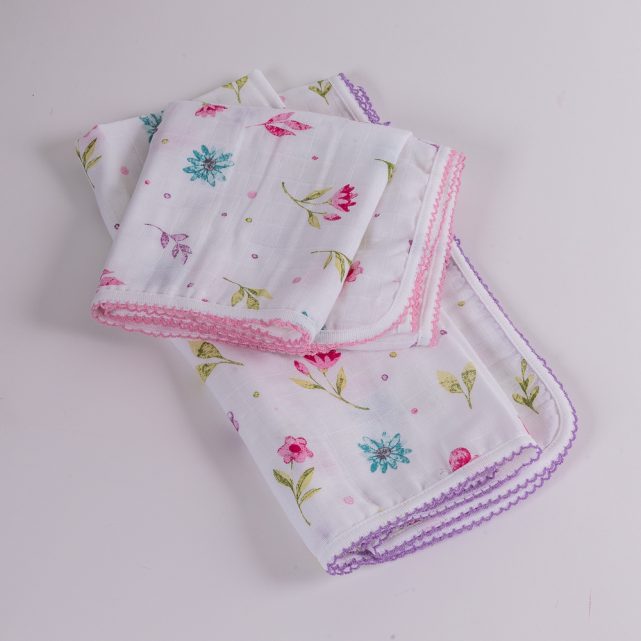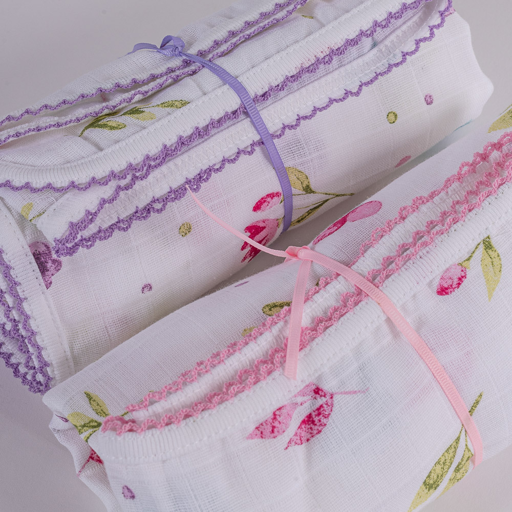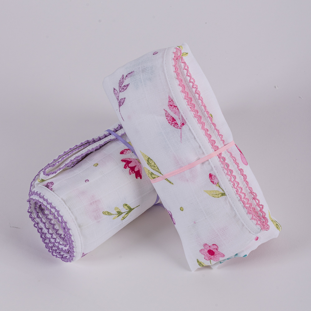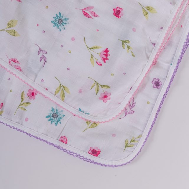 - Πάνα αγκαλιάς μουσελίνα 100% βαμβακερή, σε υπέροχα σχέδια και με ροζ και μωβ μπιμπίλα στο τελείωμα.